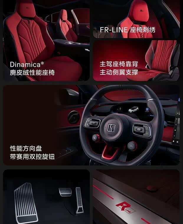插足车内,黑曜红内饰主题营造出热烈的性能氛围。细节上禁受了带有赛用双控旋钮的浮现标的盘、Dinamica材质性能座椅,主驾驶座椅配备主动侧翼撑握功能,并绣有FR-LINE记号。金属踏板与FR-LINE迎宾踏板也增添了专属感。