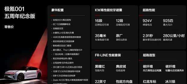 4月10日,极氪品牌为记念竖立五周年,崇拜推出极氪001五周年记念版车型,起售价为36.5万元。该车型基于900V纯电架构打造,0-100km/h加快时代仅需2.91秒,最高车速可达280km/h,并搭载专属赛谈款式与表里饰套件。