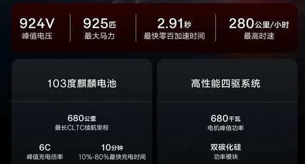 能源性能是本次升级的要点。极氪001五周年记念版禁受900V纯电平台与双碳化硅四驱系统,系统峰值功率高达925马力。续航方面,车辆搭载103kWh麒麟电板,支握6C快充技艺,电量从10%充至80%仅需约10分钟,CLTC工况下最大续航里程为680公里。