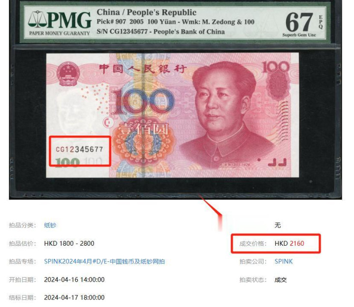 连号价钱也不低,这张12345677号码的99版100元拍出了2160港币的价钱。