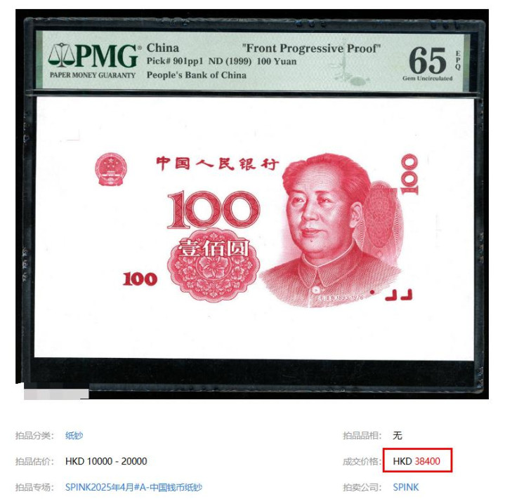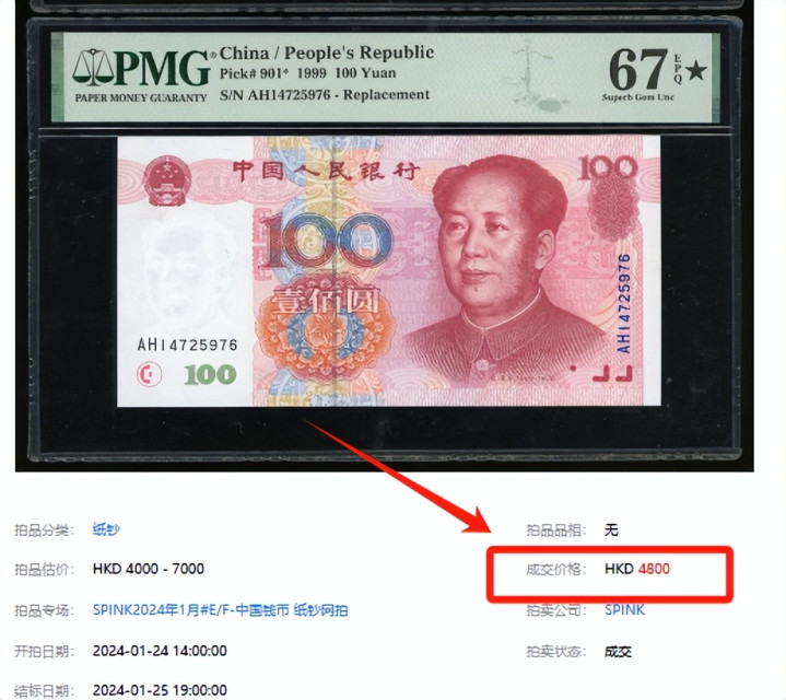 就在昨天(4月9日)SPINK的拍卖会中,就出现了多张罕有的99年100元。