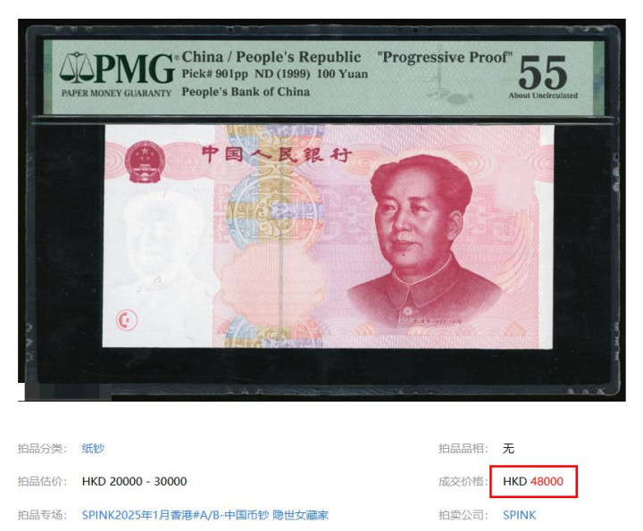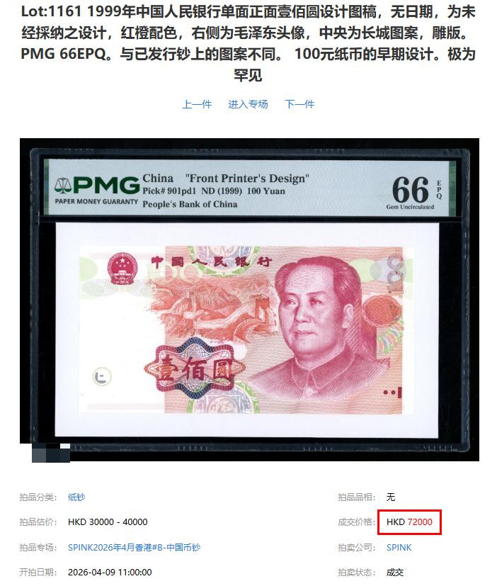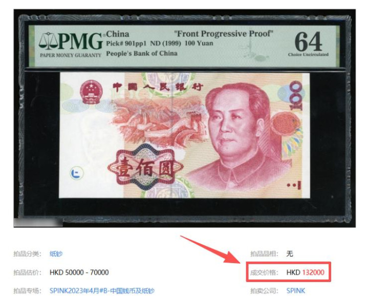 像上图中的100元,合座为红橙配色,右侧为伟东说念主头像,中央则为雕版长城图案。拍卖会上最终以7.2万港币成交。