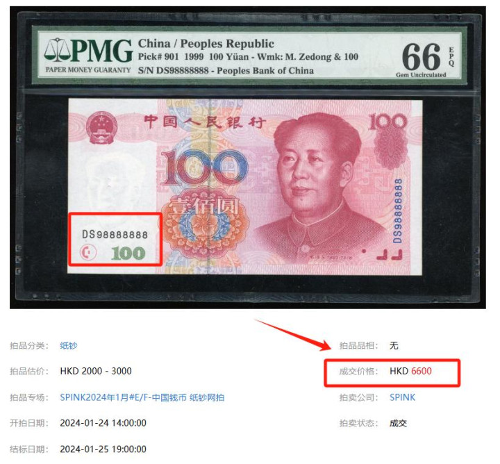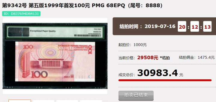 比如2019年的拍卖会上,一张尾号8888的100元首发币就以3万多的价钱成交。