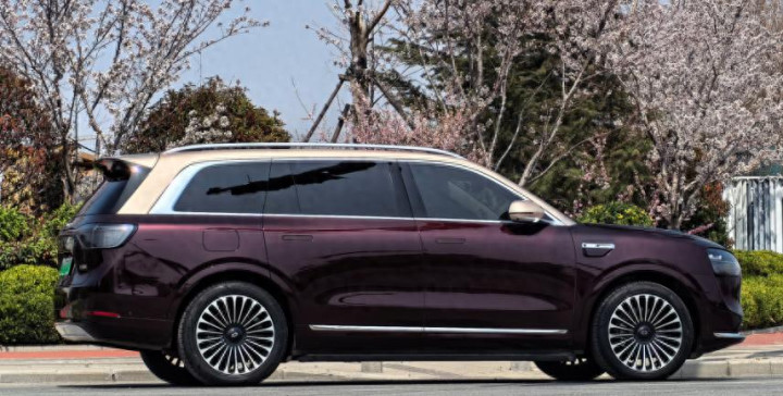 问界M9车型侧面 · 酒红配金棕顶的SUV,停在吐花树木旁