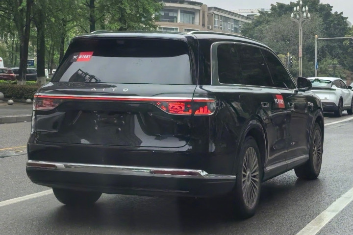 全新问界M9实车尾部 · 玄色SUV尾部,带AITO标记联扫尾灯