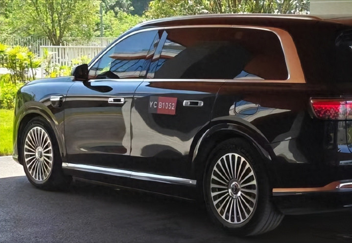 全新问界M9实车侧面 · 玄色带金棕饰条的SUV侧面,配竖条轮毂