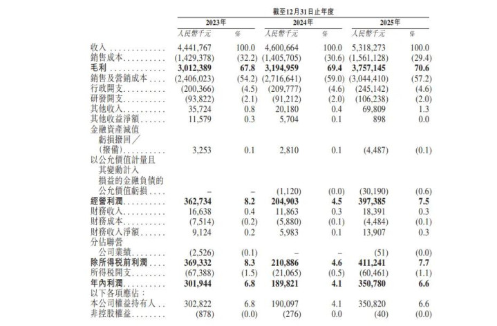 据财务数据袒露:2023–2025年,公司营收辞别为44.41亿元、46.01亿元、53.18亿元,三年复合增长率约9.43%;毛利率辞别为67.80%、69.40%、70.65%。