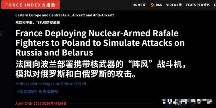 最近法国干了件大事,平直把全天下的视力都招引曩昔,2026年4月24日,好意思国军事不雅察报谈,法国把能佩戴核刀兵的阵风斗殴机部署到了波兰,还要和波兰搞皆集演习,模拟对俄罗斯和白俄罗斯实施核打击。