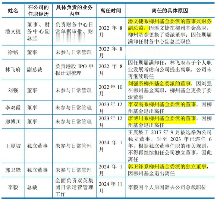 下野的高管中,部分为柳州基金委任,跟着柳州基金的退出而离任。包括董事、财务副总监潘文捷;董事刘强、李双霞、廖博川;沉寂董事郭卫锋。