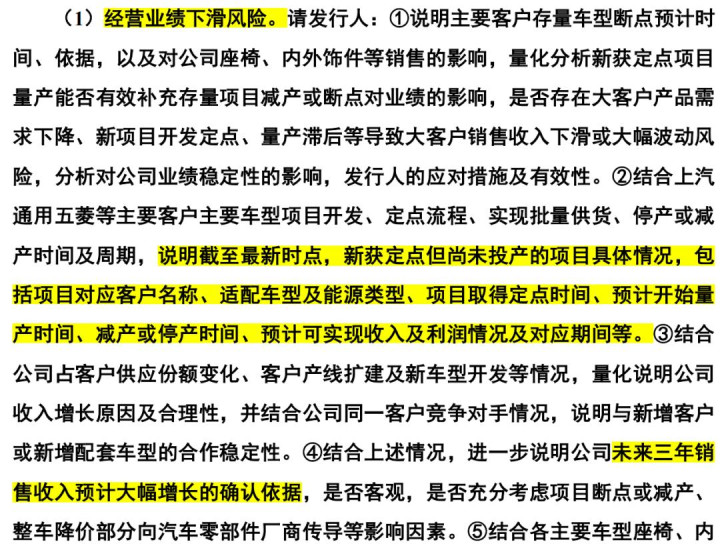 3、事迹增长执续性及核查充分性。截止最新时点,新获定点但尚未投产的技俩具体情况:公司将来三年销售收入展望大幅增长的说明依据,是否充分商量技俩断点或减产、整车降价部分向汽车零部件厂商传导等影响成分。